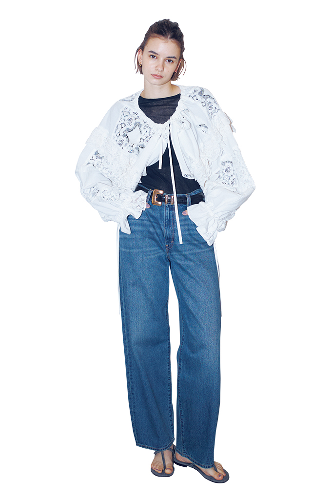 ブルーワイドデニムパンツ 14,300円/リーバイス® フォア ジャーナル スタンダード(ジャーナル スタンダード 自由が丘店) 黒バックオープンシアートップス 14,300円/カオス(カオス表参道) 白レースボレロ 16,995円/フリーダ(フリークス ストア渋谷) グレースエードサンダル 20,900円/ラオコンテ(エディット フォー ルル) ピアス 19,800円/ete ベルト 75,900円/デアンシェ(S&T)