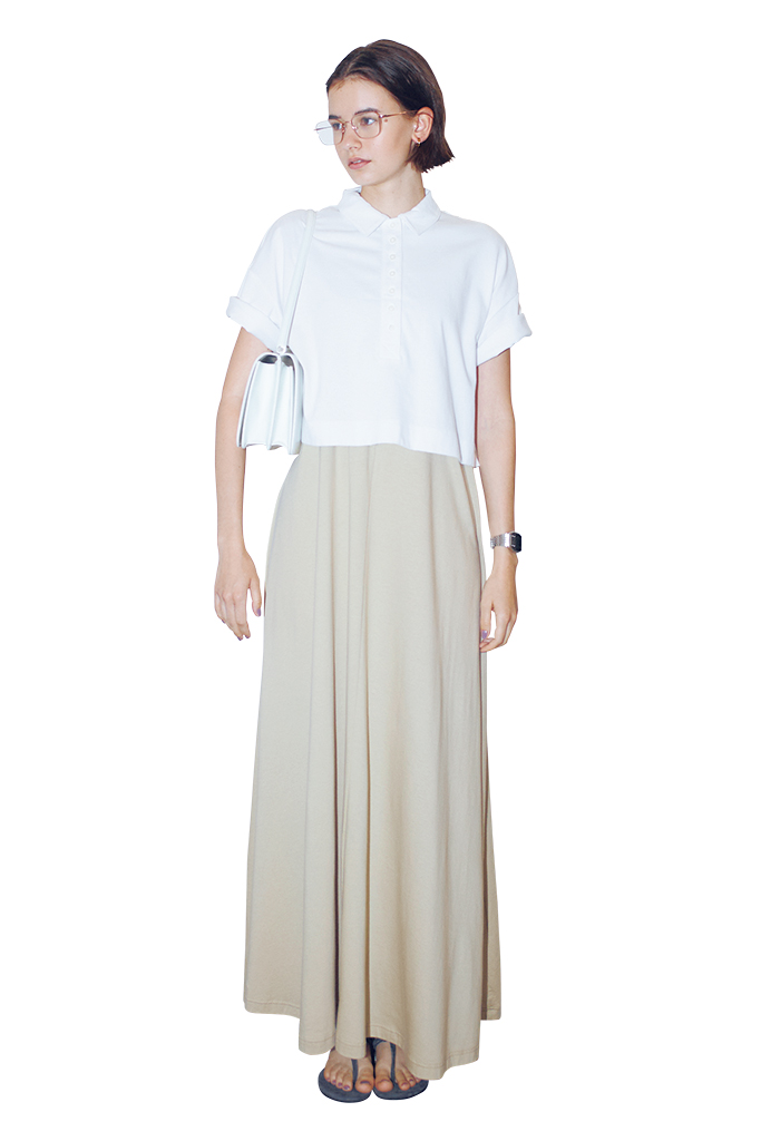「短い・長い」の極端なレングス差で優雅なシルエットのゆるみをカット。ショート丈のポロシャツを重ねて、ワンピをスカートライクにアレンジ。腰まわりにできる切り替えが、淡い配色の間のびをセーブ。