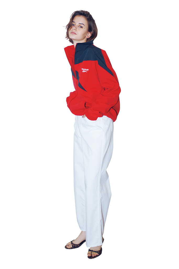 白ワイドデニムパンツ 28,600円/THE SHINZONE(Shinzone ルミネ新宿店) 赤×黒ナイロンジャケット 9,990円/Reebok キャメル×黒レオパード柄ミュール 8,990円/MANGO