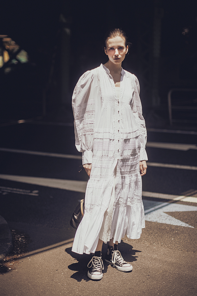いたるところに散りばめたレースが立体感と奥行き感をもたらし、1枚の白でも堂々とさまになる。パフスリーブのボリュームとも相まって、甘いというよりハンサムに。前開きだから羽織りとしても使える。