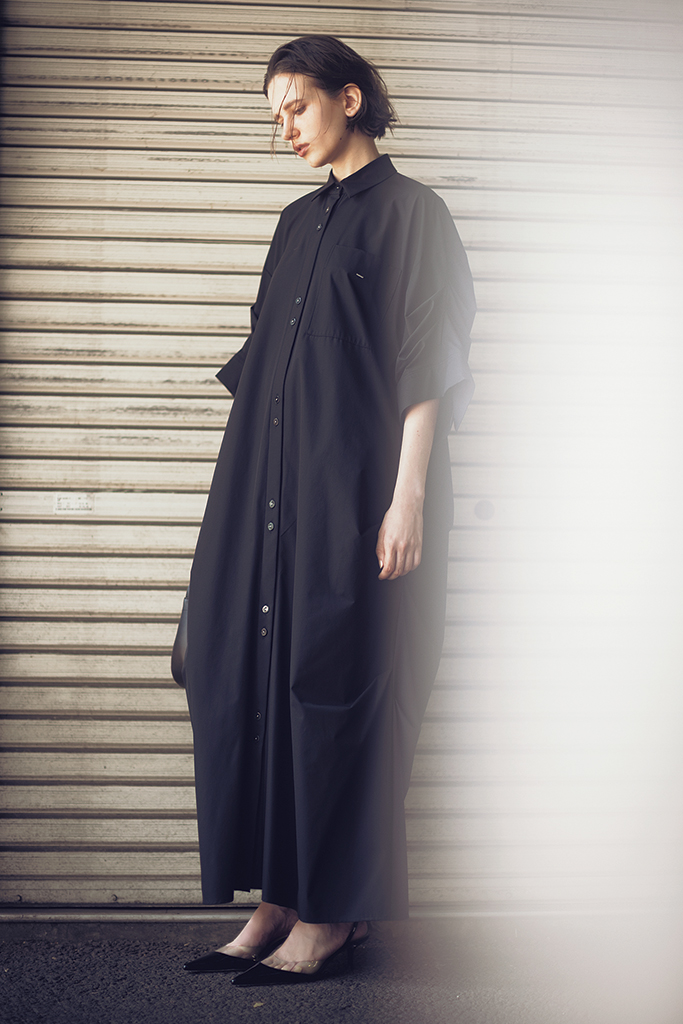 シャツワンピース 29,700円/イウエン マトフ(ユナイテッドアローズ 渋谷スクランブルスクエア店) ヒザ丈で、たっぷりとした身幅でありながら、ウエストラインにさりげなくくびれを効かせることで、全体をすっきりと見せてくれるデザイン。シャープな襟元や、程よいボリューム感のある袖が、シンプルな黒に奥行きをプラス。動くたびに生まれるドレープと、計算された立体感が、着る人の所作まで美しく見せてくれる。
