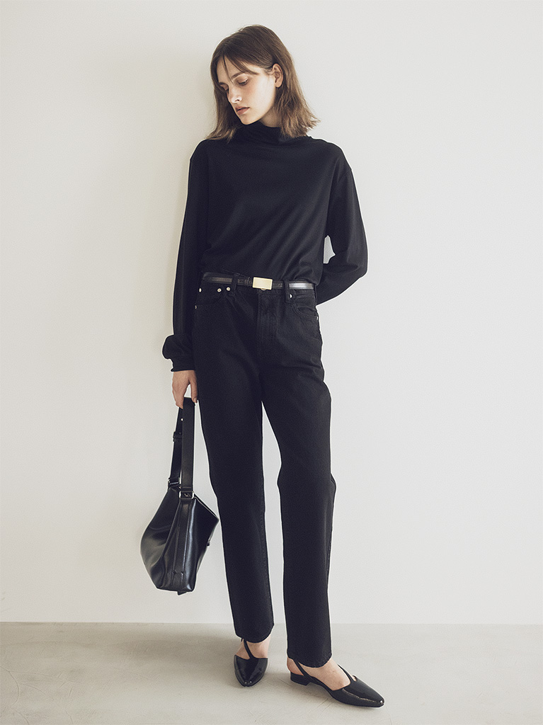 【POINT】腰まわりはコンパクトながら脚線を拾わない絶妙なゆるさ黒デニムは、アッパーハイツ×アマリーとのコラボアイテム。タックIN+ベルトで引き締めてすっきりと。