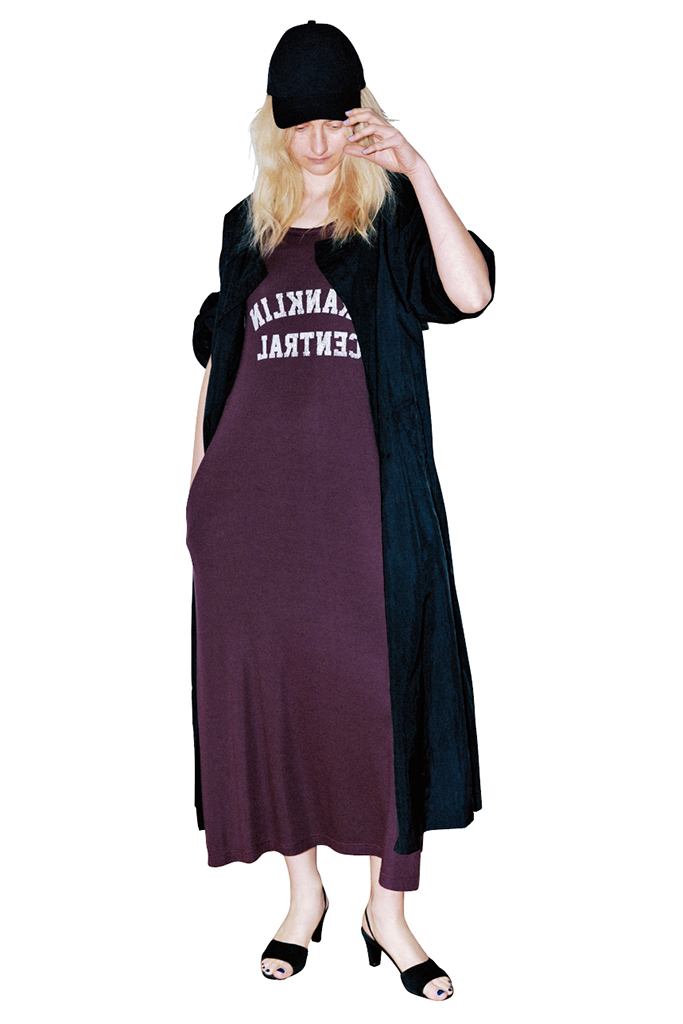 ボルドーロゴ入りノースリワンピース 23,100円/St.Johns 3rd Club(アマン) 黒ナイロンコート 108,900円/ATON(ATON AOYAMA) キャップ 13,200円/La Maison de Lyllis(エリオポール代官山) サンダル 33,000円/エディット フォー ルル