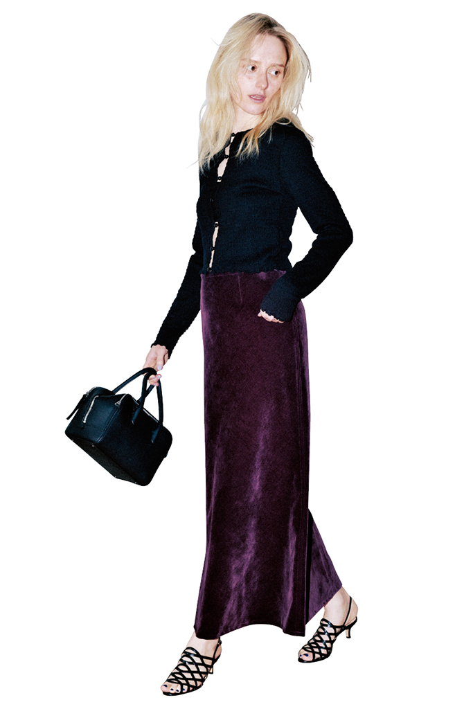 黒カーディガン 23,100円/PHEENY ボルドーコーデュロイスカート 33,000円/ベッド&ブレックファスト(グリードインターナショナル) バッグ 53,900円/VASIC(ヴァジックジャパン) サンダル 86,900円/ネブローニ 中に着たベアトップ/スタイリスト私物
