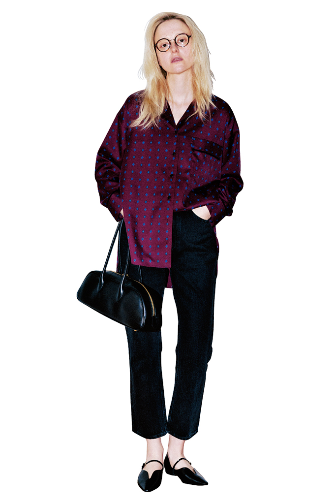ボルドーシャツ 36,300円/THE SHINZONE(Shinzone ルミネ新宿店) 黒デニムパンツ 26,180円/Oblada(シンチ) 眼鏡 19,800円/THE BEDFORD HOTEL(キングスター) バッグ 110,000円/ウィズグッドシューズ(エストネーション) フラットシューズ 30,800円/ヘンリエンヴァーゴ(プルミエ アロンディスモン)