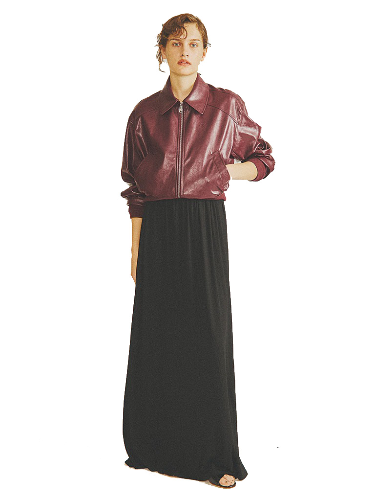 ボルドーレザーブルゾンジャケット 36,300円/カルバン・クライン(カルバン・クライン カスタマーサービス) 中に着た黒ロングワンピース 38,500円/デターム(ザ・ウォール ショールーム) ミュール 34,100円/ファビオルスコーニ(エディット フォー ルル)
