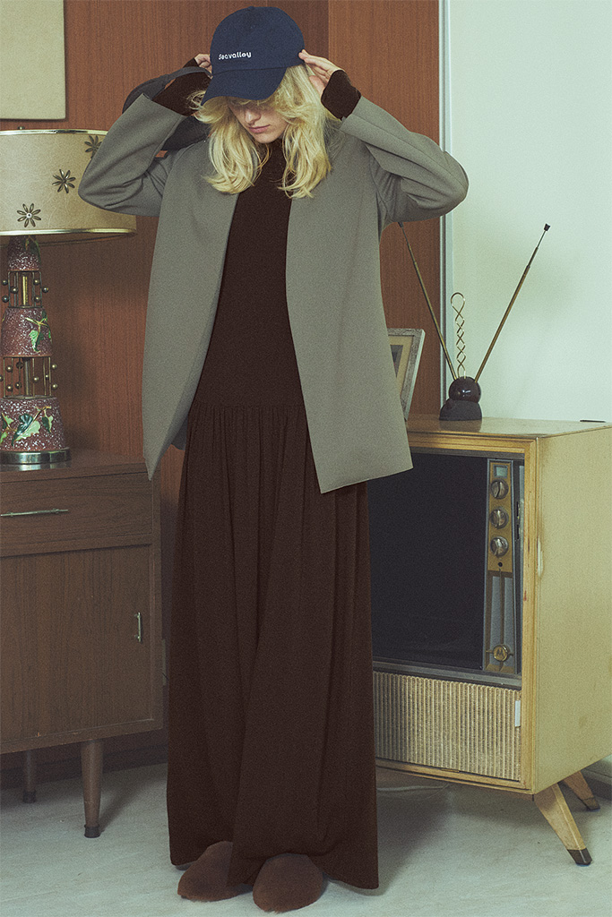 【POINT】アムンゼン生地を使用した人気のノーカラージャケットに新色が登場。グレージュのはっきりしない色みとカーディガンのような形で、ブラウンワンピースのリラックス感をそこなわずに済む。