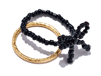 リング(2本セット) 1,430円/アネモネ(サンポークリエイト) 丁寧に編まれた黒のビーズリボンと、繊細なテクスチャーのゴールドリング。異なる個性を持ち合わせた2本を重ねれば、甘さと辛さが絶妙に調和した奥行きのある手元が完成。