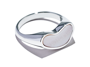 ストーンリング 16,500円/ete シグネットリングのようなボリューム感のあるフォルムに、ハートシェイプのピンクシェルをはめ込んで。ハンサムな佇まいの中に、光の角度によって表情を変えるシェルのやわらかな輝きが、ほんのりとした甘さをのぞかせる。シルバーのクリーンな印象が、可憐なモチーフを知的に見せてくれる絶妙なバランス。