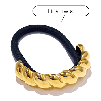 ヘアゴム 12,100円/PETIT MOMENTS(ZUTTOHOLIC) ただ髪を結ぶだけのシンプルなポニーテールも、ゴールドの装飾があるだけで一気にレディな後ろ姿へ。ツイストされたようなデザインが、光を受けてきらめき、動くたびにエレガントな余韻を残す。使わないときはブレスレットのように手首につけておいても様になる。