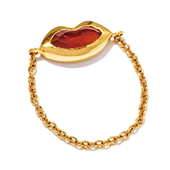 リップリング 7,260円/Pignatta(ZUTTOHOLIC) つややかなリップモチーフのチェーンリング。ストーンで表現された唇が、手元にユニークな遊び心をプラス。華奢なゴールドチェーンだから、キャッチーなデザインでも品よくまとまるのが嬉しい。ネイルとのカラーコーディネートを楽しむのも〇。