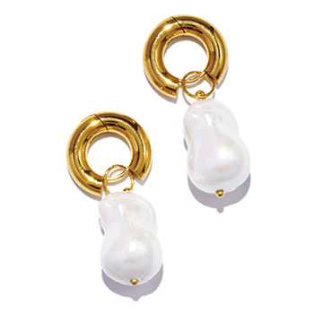 パールピアス 6,160円/PETIT MOMENTS(ZUTTOHOLIC) ぽってりとしたゴールドのフープに、ひとつとして同じ形のないバロックパールをドッキング。クラシカルなパールのイメージをモダンに更新する、存在感のあるデザイン。パールの柔らかな光と、ゴールドの強い輝きのコントラストが美しく、つけるだけで顔色がパッと明るくなる。