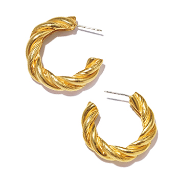 ツイストピアス 44,660円/ben-amun(ZUTTOHOLIC) ほどよいボリューム感のある、ツイストデザインのフープピアス。ヴィンテージショップで見つけたような、趣のあるゴールドの風合いが魅力。表情豊かなねじり模様が、顔まわりに立体感と華やかさをもたらす。シンプルな装いに、ちゃめっ気のあるアクセントを。