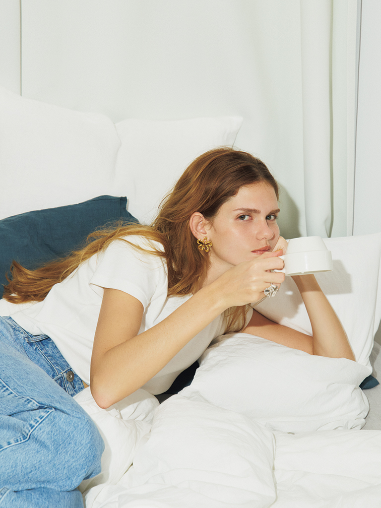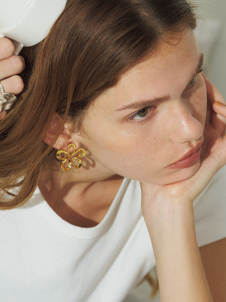 イヤリング 13,200円/IRIS47(フーブス) シルバーリング 82,940円/DEA DIA(ZUTTOHOLIC) 白Tシャツ 4,950円/Ungrid デニムパンツ 28,600円/ニードバイヘリテージ(ゲストリスト) 晴れやかな印象のフラワーイヤリングが主役。アーティな雰囲気を高めるなら、手元には大ぶり&個性派のシルバーリングをひとつ。