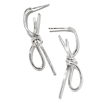 リボンピアス 19,250円/GAGAN ワイヤーを無造作に結んだような、ラフなリボンモチーフ。あえて縦に長く配置したシルエットが、甘くなりがちなモチーフをすっきりと大人びた表情に導いてくれる。凛としたシルバーの輝きも相まって、可愛げとクールさを両立。シンプルな白Tシャツに合わせるだけで、飾り気のあるスタイルが完成する。