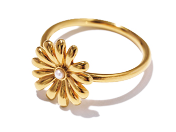 花リング 19,800円/ete 幼い頃に見たような、どこか懐かしさを感じるマーガレットモチーフ。中央にあしらわれた小さなパールが、上品なアクセント。ゴールドのつやめきが、愛らしいモチーフをぐっと大人っぽく昇華。デニムなどカジュアルな装いに、そっと添えたい可憐なリング。