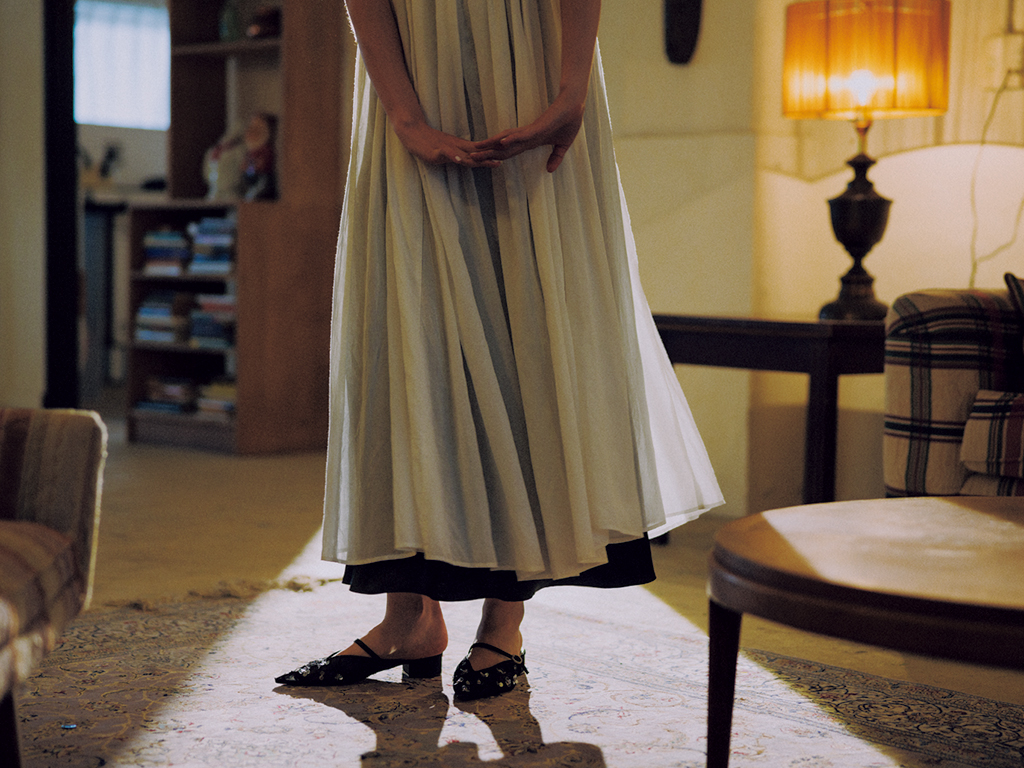 1枚でも十分な華やぎが得られるワンピースに、サテンスカートを仕込んでデザインドレス風に。軽やかに移ろうサテンのツヤめきが足元の飾り気に。サテンスカートのすそがフリルのように重なることで、しとやかなワンピースに奥行きが誕生。