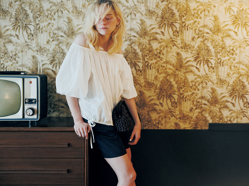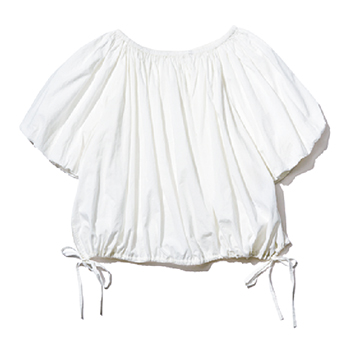 ボートネックにしても着られる2WAY。華奢な体を連想させる、身ごろからすそにかけての構築的なふくらみ。ブラウス以外はミニマムな暗色でまとめて、オフショルダーを主役級の存在感に引きたてて。