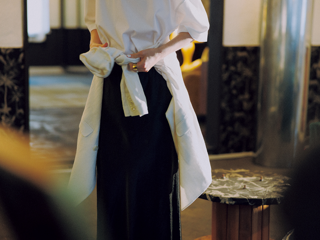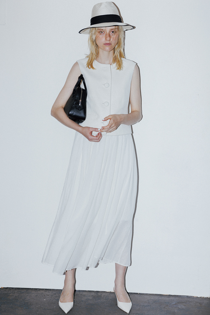 細身のシルエットを貫いて淑女のような甘いムードにキレを加算。ミニマムなベストと縦長感を強調するサテンスカートですらりとした輪郭が誕生。