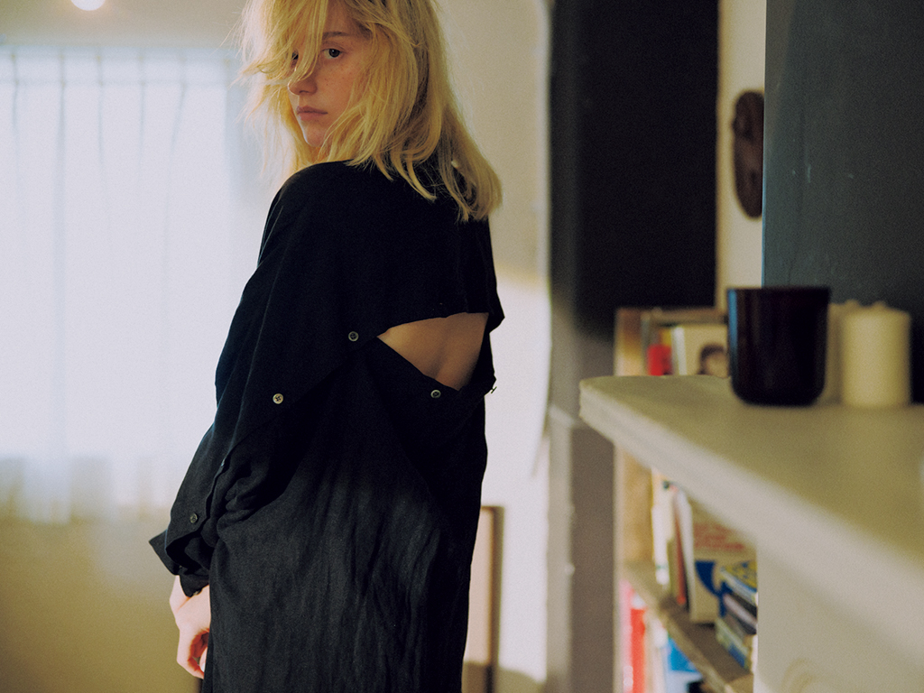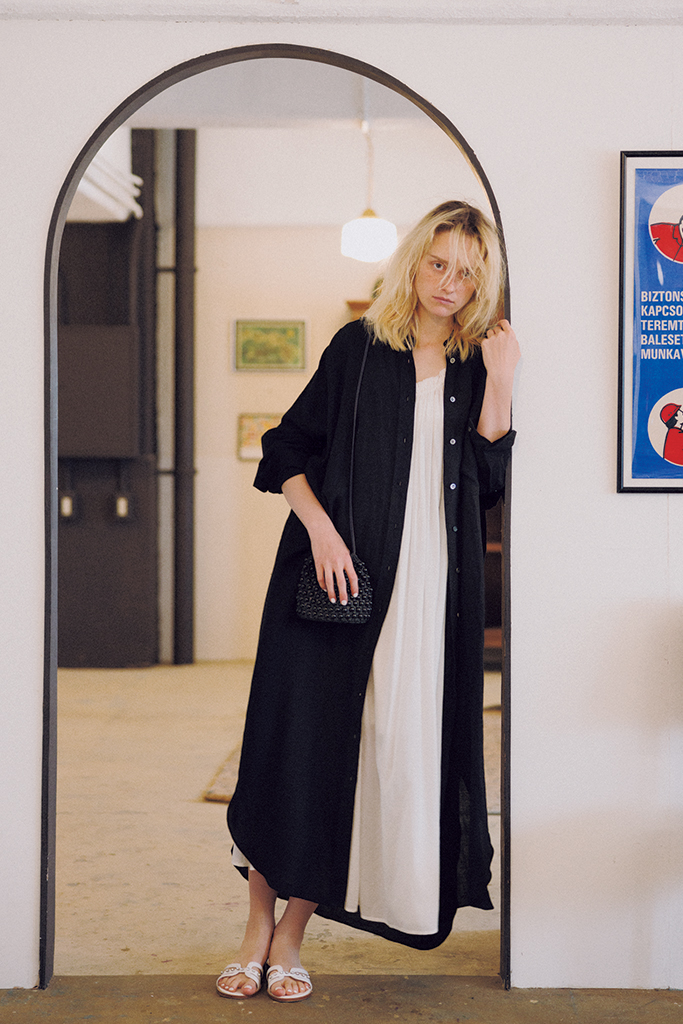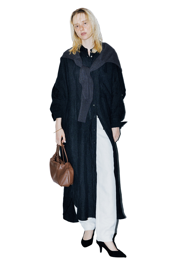 黒の柔和な表情を引き出すルーズ+ルーズ。2枚のワンピースのレイヤードによるゆるやかなAライン。あいまいに広がるシルエットによって、黒の印象を和らげる結果に。シャツワンピースからのぞく細長い白が、ボリューミィなフォルムのキレとして作用。