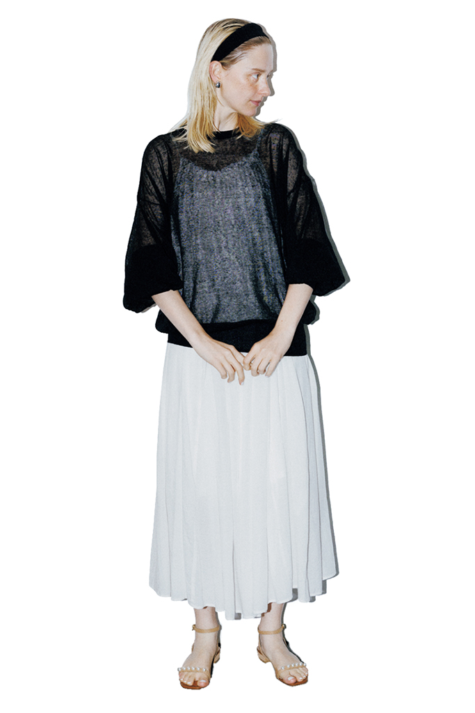 やわらかい白がほんのり透けることで、奥ゆかしさを生む。シアー素材で抜け感を出せるから、ボリュームワンピにレイヤードしても膨張を回避。