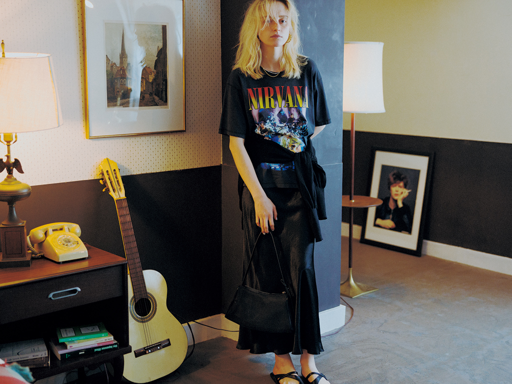 ニット 24,200円/ウィム ガゼット(ウィム ガゼット 丸の内店) サテンスカート 19,800円/uncrave ロックTシャツ(メンズ) 7,990円/Gap ネックレス(上) 12,100円/ココシュニック オンキッチュ(ココシュニック) ネックレス(下) 21,560円/FULL OF GRACE(ZUTTOHOLIC) バッグ 7,700円/MOUSSY(バロックジャパンリミテッド) サンダル 62,700円/ジアボルギーニ(ショールーム ロイト)