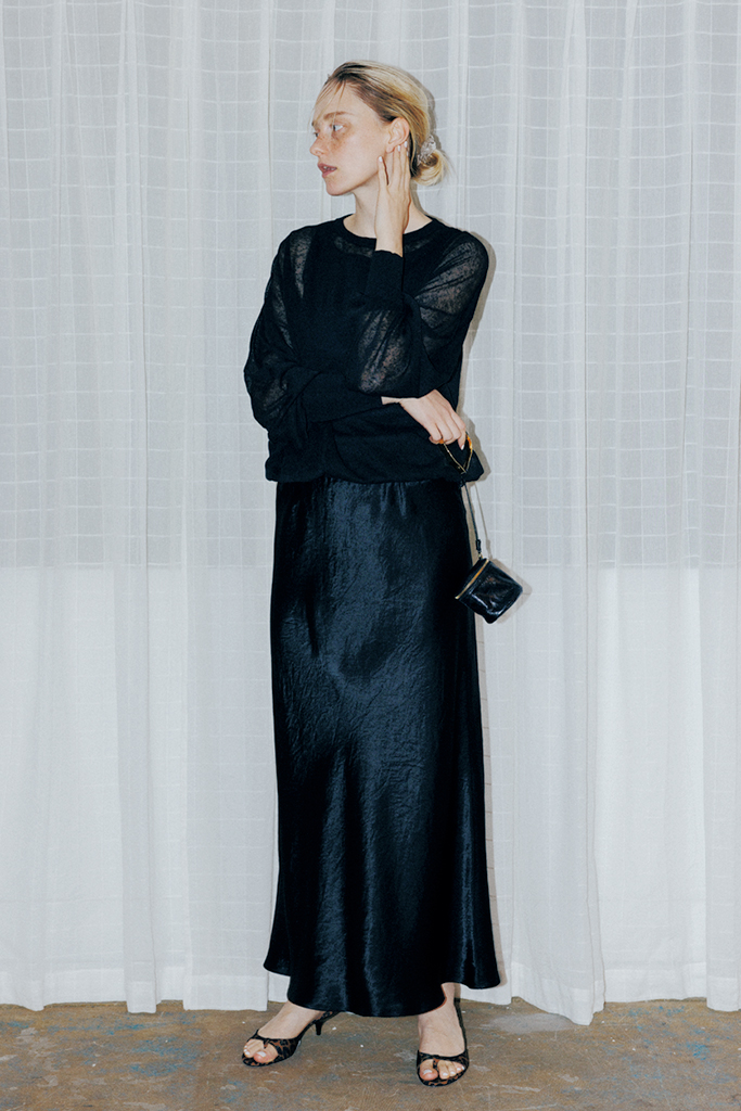 ツヤめくサテンをドライなニットでしずめて気だるげなムードを質感で表現。レディ度が高まるサテンを、かわいたニットでゆるめてセンシュアルすぎないさじ加減に。ミニマルなポーチバッグをそえて、遊びゴコロをプラス。