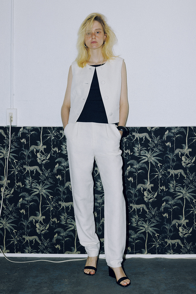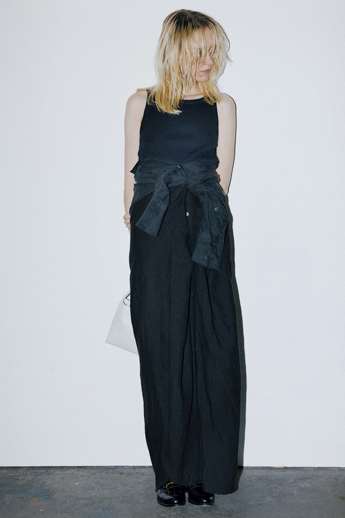 肌すらも装飾となる究極シンプルな組み合わせが、冷静なモノトーンの美しさを引き立てるギミックに。二の腕を細く見せる黒のリブタンクと、上質な素材の白のリネンパンツ。ムダをそぎ落とした、その潔いミニマルさによって、アクセサリーで飾り立てずとも絵になる姿が確立。