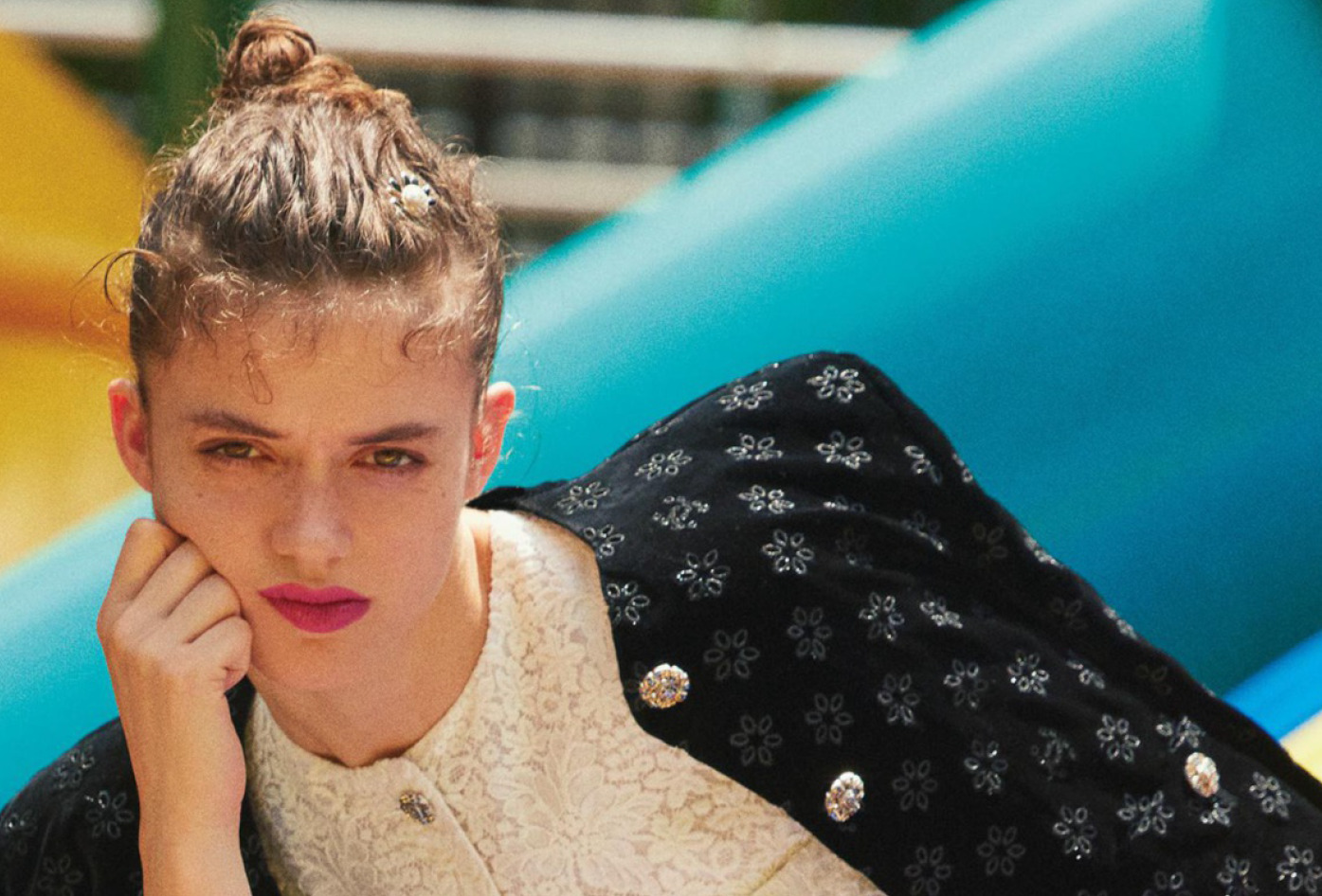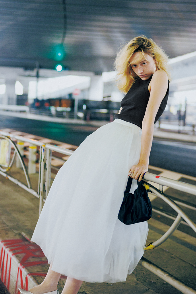 タンクトップ(3枚セット) 9,900円/THROW by SLY(バロックジャパンリミテッド) チュールスカート 46,200円/HER. ピアス 2,420円/アネモネ(サンポークリエイト) リング 34,100円/カラ・ユ(ショールーム ロイト) バッグ 15,400円/ACOC(ジャック・オブ・オール・トレーズ プレスルーム)