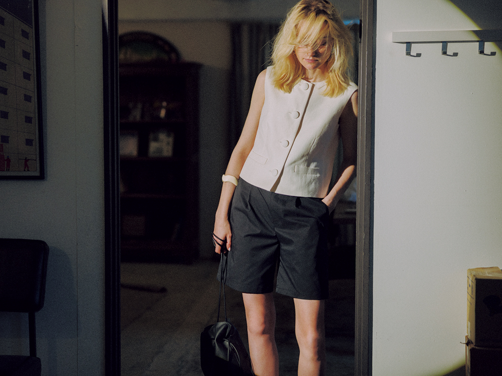 タンクトップだと幼さが残るノースリ×ショートパンツ。まじめなベストを選びつつ、コンパクトな白黒できっちり区切るカラーブロックが、大人のショート丈の攻略方法。