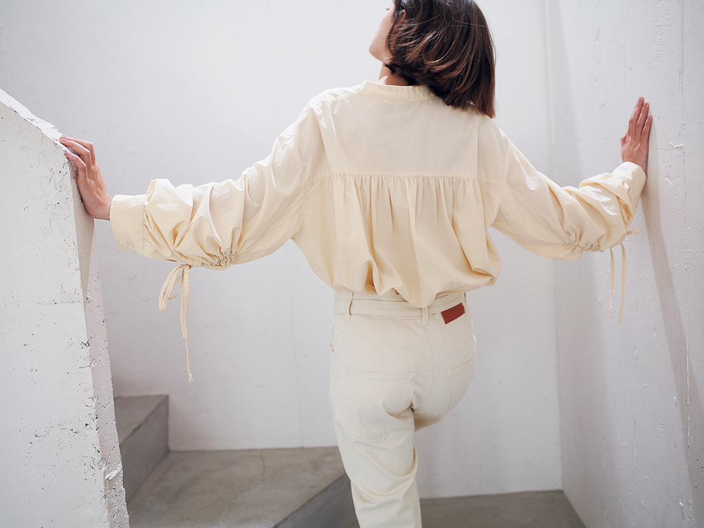 アイボリースリーブギャザーシャツ 11,880円/SeaRoomlynn オフホワイトベルトつきパンツ 39,600円/Bed&Breakfast(グリードインターナショナル)