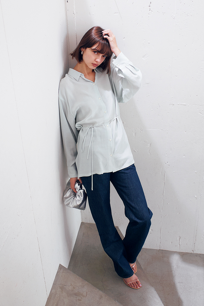 ミントグリーンバックスリットシャツ 18,920円/FRAY I.D(FRAY I.D ルミネ新宿2店) シルバーピアス 19,360円/バルブス(ZUTTOHOLIC) バッグ 13,750円/HELOYSE(ユー バイ スピック&スパン ルミネ池袋店) サンダル 19,800円/Mollini(エディット フォー ルル) デニムパンツ/スタイリスト私物