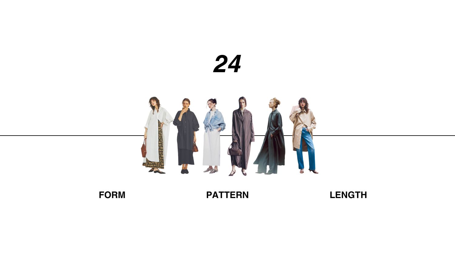 素材自体に表情があるから、1枚でさらっと着るだけでさまになり、ボタンを上まできちんと閉めることで、ルーズなシルエットが知的に好転。硬派な黒レザーのクラッチバッグとローファーを添えて重厚感をプラスすれば、さらにフォーマルな表情へ昇華。サイドスリット入りのため、Iラインでも足さばきは良好。