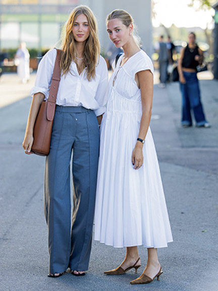 シンプルな装いが多くを占めるからこそ、スタイル・バランスが重要。白シャツをハイウエストのパンツにタックインしたり、胸下で切り替えられたワンピースを選んだりと、ごく自然に腰の位置を高く見せるテクニックに注目。タイムレスなアイテムこそ、こうした一手間が洗練度を格段に引き上げる。