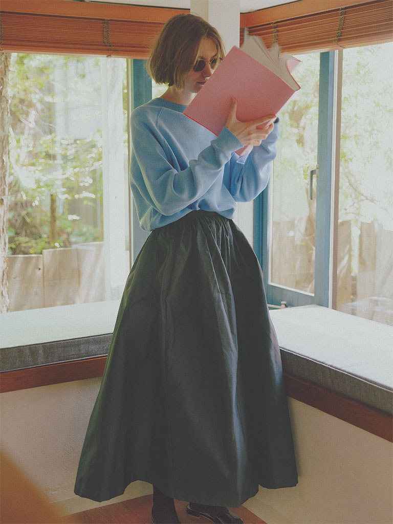 【POINT】ワイドとコンパクトの絶対的な上下バランスを、スウェットスタイルにも反映。ボリューミィなスカートで下に重みが出るときは、ジャストサイズを選び、さらにタックINすることで全体をすっきりと仕上げて。