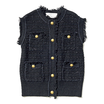 ニットベスト 30,800円/ウィム ガゼット(ウィム ガゼット ルミネ新宿店) 随所にあしらわれた切りっぱなし風のフリンジが、上品な中に気楽な印象をプラス。