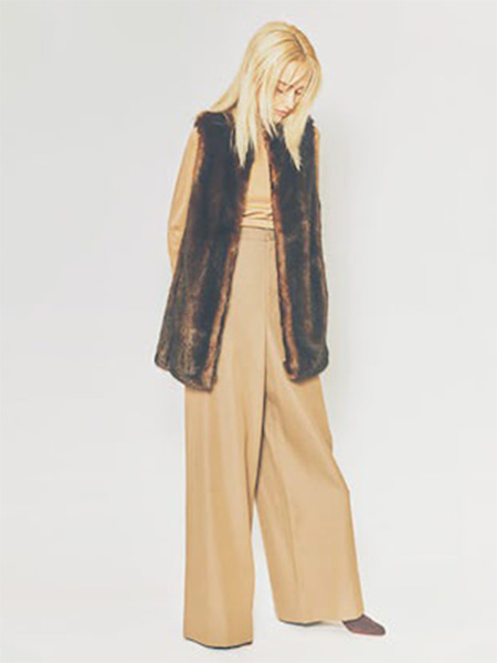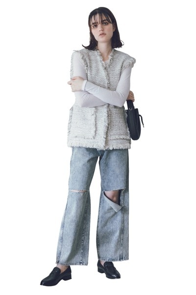 ルーズなワイドパンツを正統派なムードに導くベスト。ふわふわとした素材やツイード生地など、幅広ボトムと差がつきすぎずちぐはぐしにくい、重みのある質感からセレクト。ほどよく身ごろがあるぶん、薄手のカットソーやタートルなど長そでとのレイヤードもしやすいデザイン。