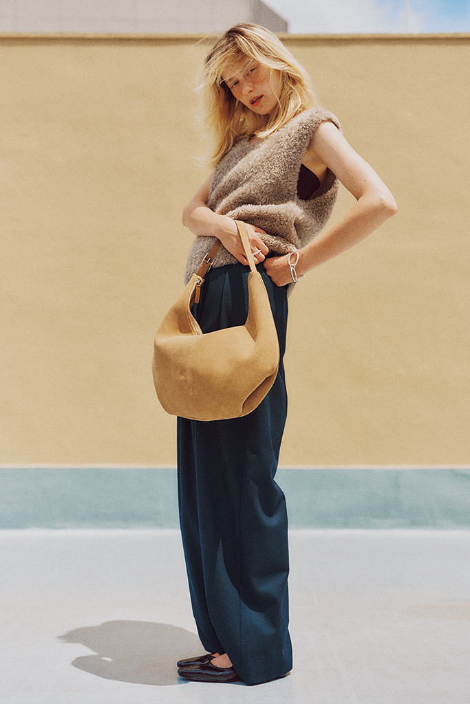 涼しげなシアートップスにあたたかなウール素材を採用。真っ白じゃないからベージュのワントーンに自然となじむ結果に。着方が難しいブラトップ型は、編み目の大きなニットならゆとりもあって挑戦しやすい。