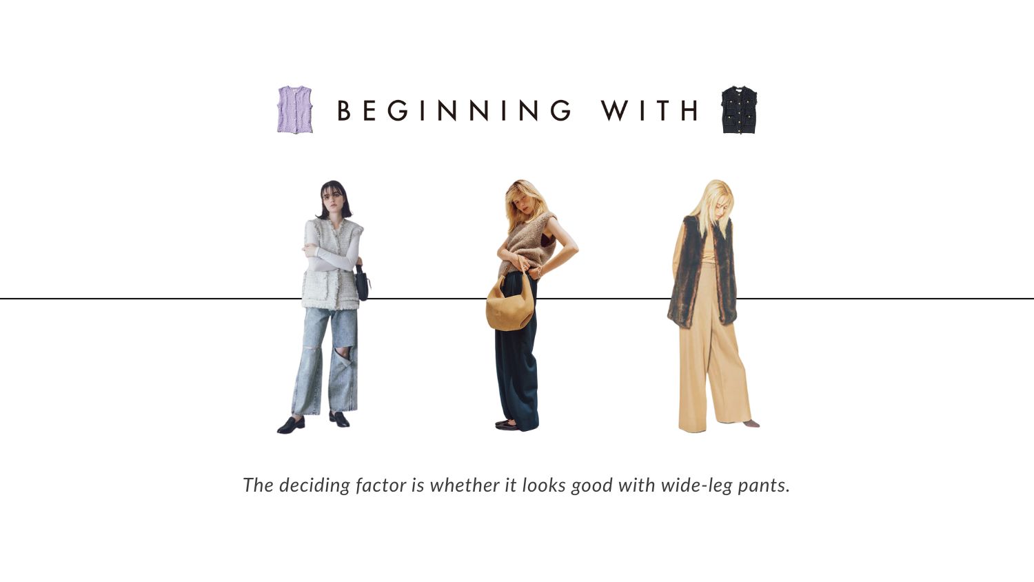 ルーズなワイドパンツを正統派なムードに導くベスト。ふわふわとした素材やツイード生地など、幅広ボトムと差がつきすぎずちぐはぐしにくい、重みのある質感からセレクト。ほどよく身ごろがあるぶん、薄手のカットソーやタートルなど長そでとのレイヤードもしやすいデザイン。