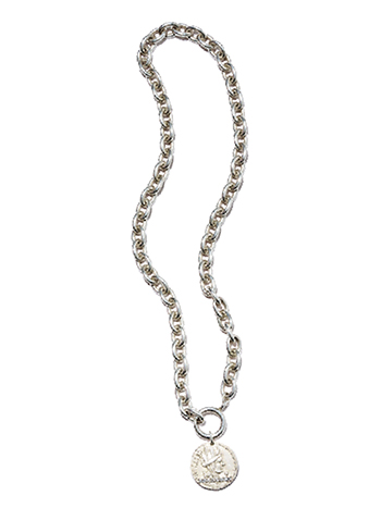 チェーンネックレス 40,700円、コインチャーム 39,600円/ともにENEY(ショールームリンクス) 大地母神を描いたコインと、重厚感のあるチェーン。凹凸のあるラフな風合いが、首元にハンサムなアクセントを。シンプルなニットやスエットに合わせて。