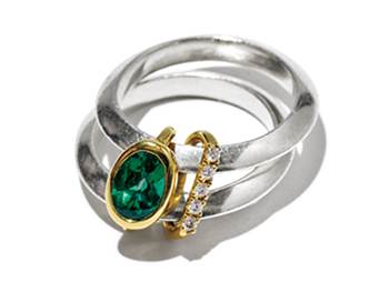 エメラルド2連リング 110,000円/ENEY(ショールームリンクス) シルバーの2連リングに、エメラルドグリーンとダイヤのチャーム。これひとつで、計算されたレイヤードスタイルが完成する高貴なデザイン。