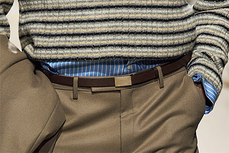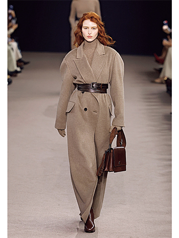 ロング&リーンなグレージュコートの上をぎゅっと引き締める、幅太のレザーベルト。あいまいなトーンがぼやけて見えるのを回避できます(岩田さん)