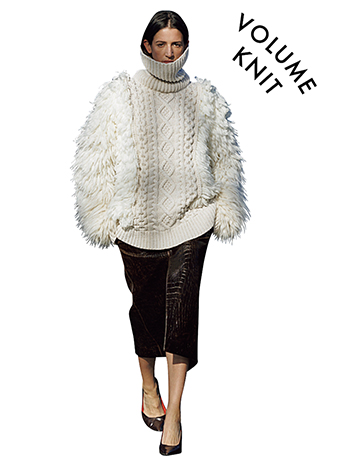 強気なレザースカートに負けない迫力の大ぶりな編み地のニット。首をすっぽりおおう、風格あるフォルムで、あたたかなニットがモードに転換(樋口さん)