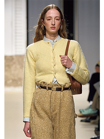 コンパクトなニットカーデの、いちばん上と下だけボタンを開けて抜け感づくり。マイルドなイエロー×ベージュにシャープなキレが生まれます(出口さん)