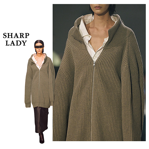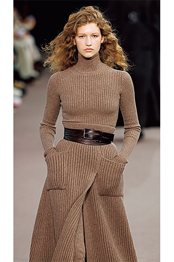 表情をやわらかく見せるヌーディカラー。体をしなやかに見せるニットでとり入れ、次なるセンシュアルへ。女っぽい表情を引き出すしっとりとしたグレージュのリブニット。肌の隙が全くないのにフェミニンに転じる印象的なLOOKです(高木さん)