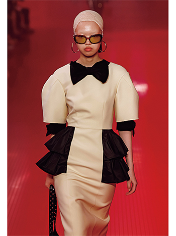 首元の大きなリボンや何段にも重なったフリルなど。わかりやすく甘いディテールを、分厚いタフな質感で辛口に仕上げる点にときめきました(樋口さん)