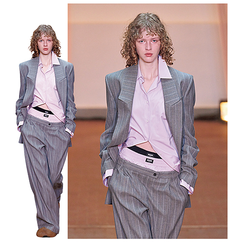 端正なグレーのセットアップに、腰からトランクスをのぞかせて今っぽく。中央のブランドロゴも、ハンサムなセットアップを退屈させない飾り気に(岩田さん)