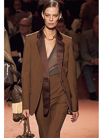 かっちりとしたジャストサイズのジャケットに、シアーインナーが抜け感に。こっくりとしたブラウンワントーンにリズムが生まれていいことづくし(岩田さん)
