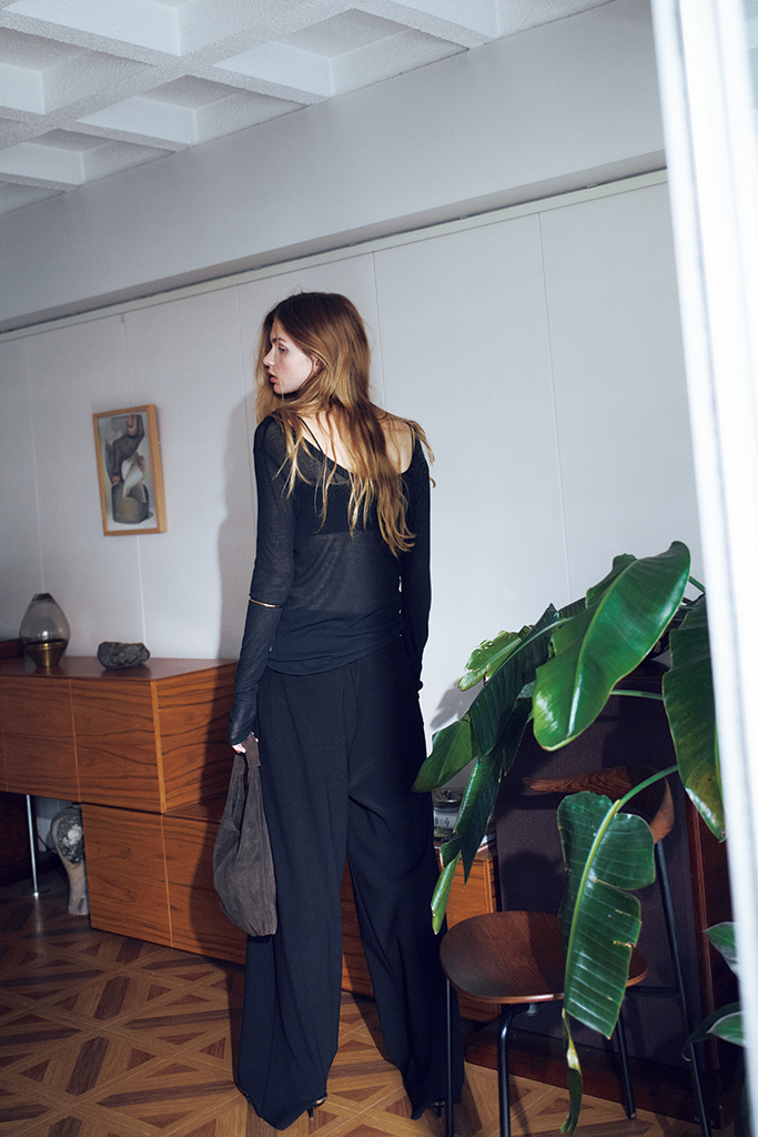 くたっとしたロンTのニュアンスで、黒1色なのにやわらかい雰囲気。ほんのりと透ける素材と大胆に開いたネックラインとのギャップで、シンプルな装いのまま奥行きが出る。羽織りの脱ぎ着でさらに印象を変えられるバックオープンデザインもポイント。