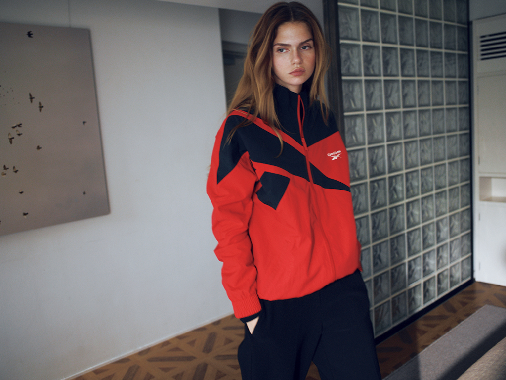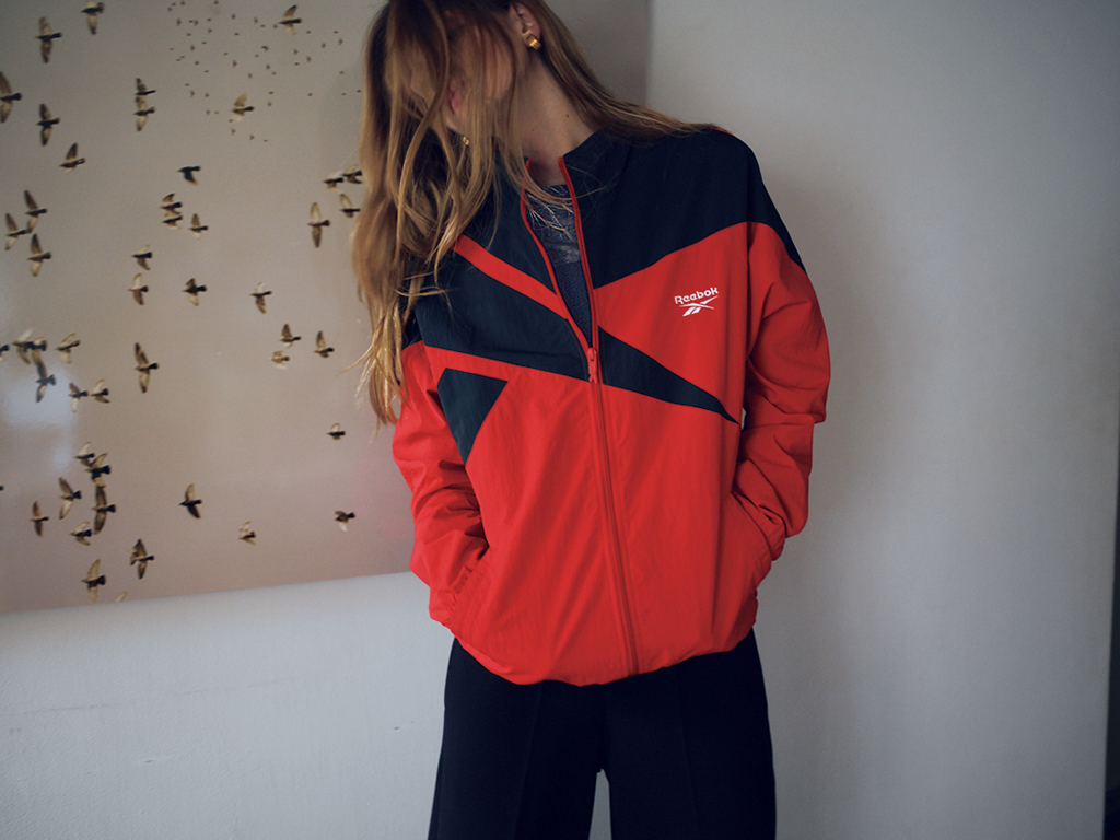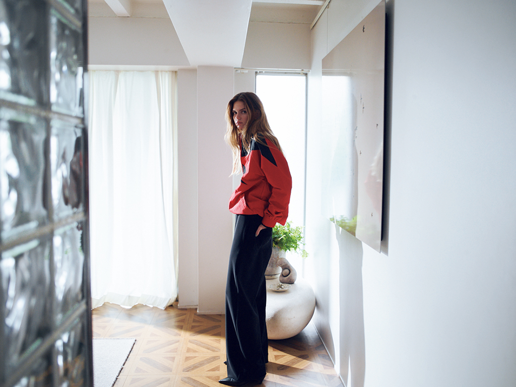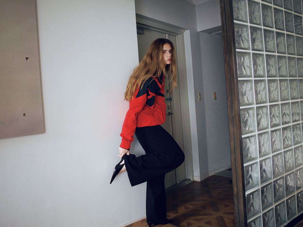 黒のワイドパンツと釣り合う、強い色でスポーティなブルゾンをセレクト。クールなイメージの中でテンションを変えるだけでも、明確に鮮度が上がる。インナーにシアーなロンTを仕込んだり、華奢な靴を合わせたり。どこかに抜けを意識すると強気な配色でもエッジが効きすぎない。